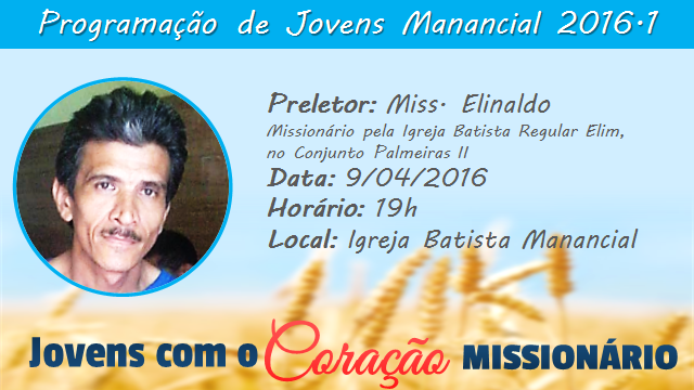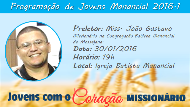 No primeiro semestre de 2016 os jovens da Igreja Batista Manancial irão focar suas programações para refletir na obra missionária, cujo o tema é "Jovens com o Coração Missionário".